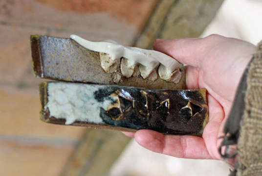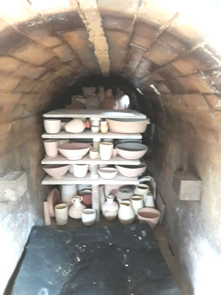 After 17 hours the pyro reading was 880°C, but cones 05, 04 & 03 at the front were all flat, (1100°C), so we were late in starting reduction. I think that this has resulted in some underdeveloped body colour - greys rather than buff in some of the clays. There was a large difference in temperature between the front and back of the top shelves.