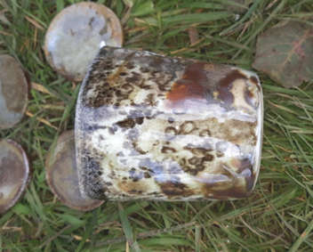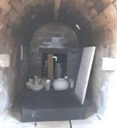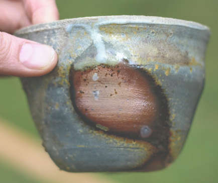 Ended firing by loading the firebox with wood and charcoal and then clamping up the kiln in order to encourage carbon trapping. This was apparent in a very few of the pots. This was an experiment. If the test kiln is to behave like the large anagamas it should be crash cooled to 1100°C as this is what would happen in the larger kilns.