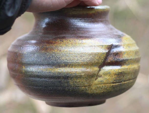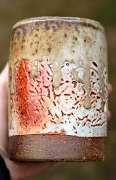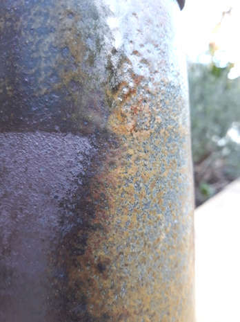 Ochre colour possibly from oak fly ash, some dry surfaces - might be good to react with exterior glazes (use saucers to catch drips) Wadding used was high alumina salt wadding, which came away more cleanly than clay/fireclay/sawdust used last time (see wadding section for recipes).