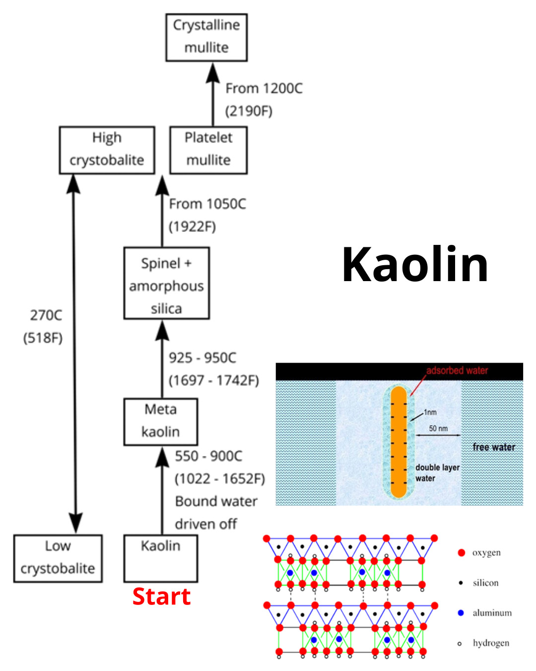During firing, it undergoes multiple transformations. Between around 550 and 900C the water is driven off as steam, and the kaolin is transformed to metakaolin - and if you put it into water, it won't go back to the original clay state. Then, between 925 and 950C, the metakaolin breaks down to form a cubic spinel crystal from the alumina and most of the silica, with the rest of the silica taking on an amorphous form.