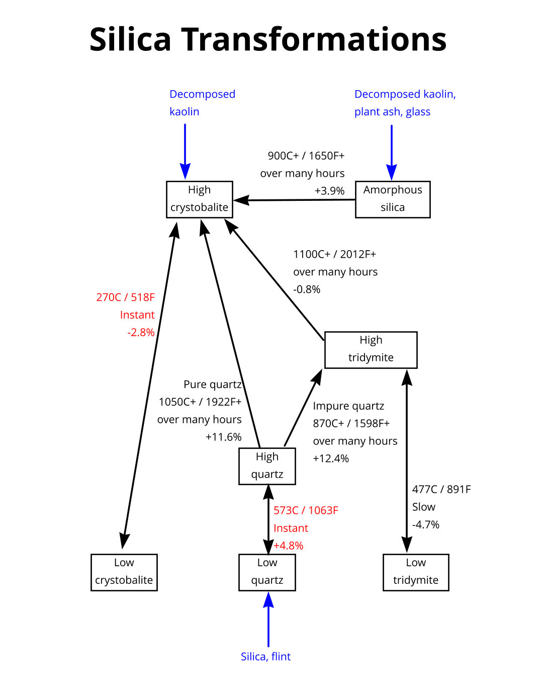 The diagram shows the transformations that may occur, the temperature and speed of the transformation, and the associated change of volume. High risk transformations are shown in red. And blue shows the sources of silica.