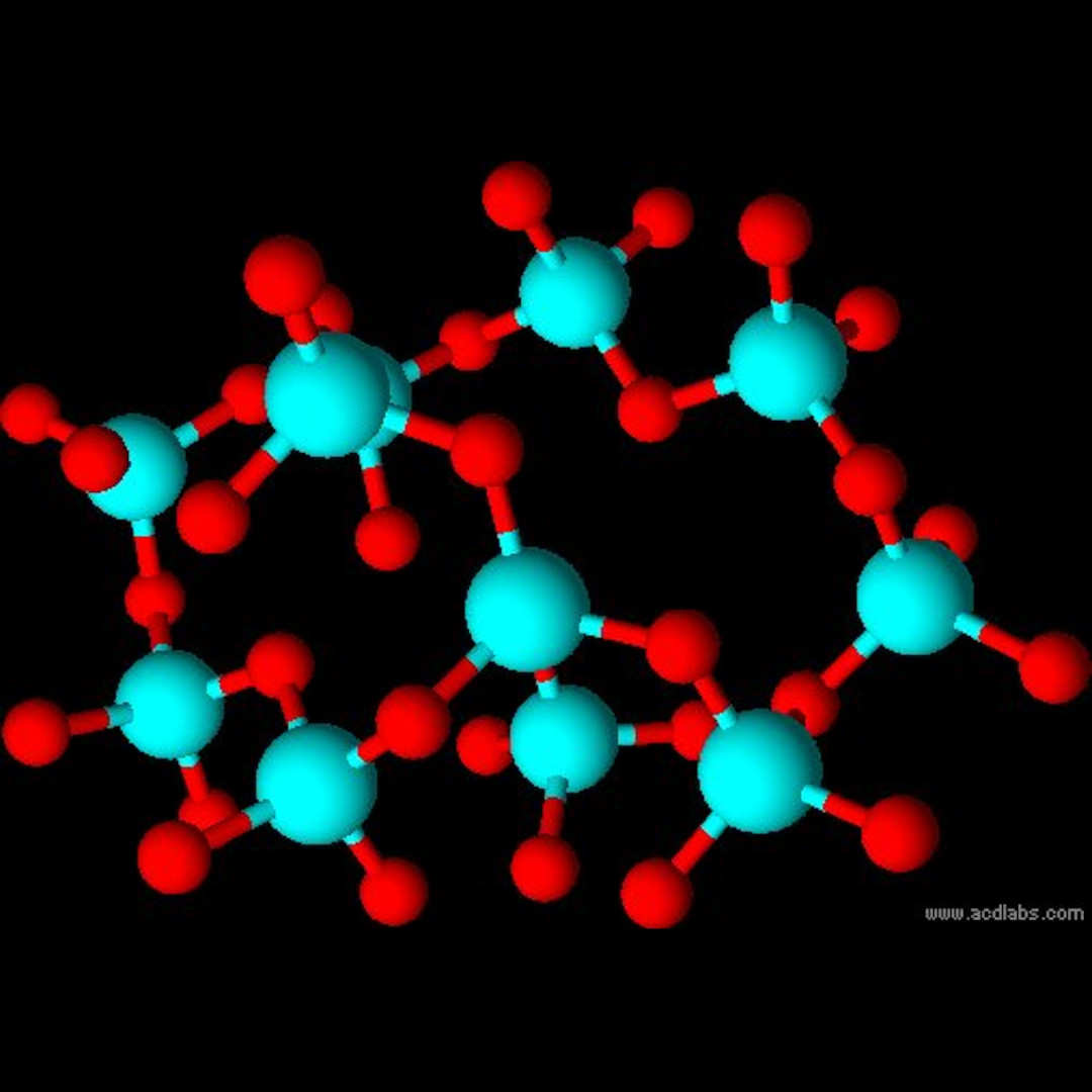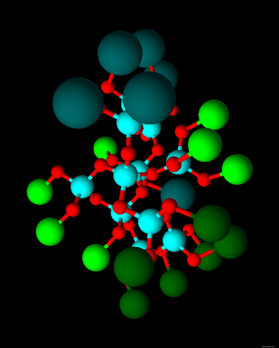 Here we have a glass/glaze of silica (light blue), oxygen (red), and various alkalis (lithium bright green, sodium dark green, potassium teal). The alkalis are connected to the oxygen atoms with relatively weak ionic bonds, replacing the hydrogen in last week's post. You can see how the tendency is to put the alkalis on the perimeter of the structure.