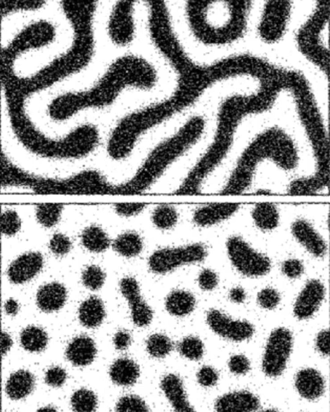 One source of phase separation is when we have two liquids that are immiscible, in at least some proportions - oil and water in mayonnaise is one example of this. If we have two substances A and B, and go from 100% A to 100% B, then as we increase B initially there is so little that it will dissolve into A, forming a homogenous mixture. But there comes a point (not necessarily close to 0) when B separates out into the isolated little globules we see at the bottom of the pic, suspended in a sea of A. Carrying on adding B, these globules expand and merge into one another, until we get the 3-d intermixed threads of A and B shown at the top of the pic. As the amount of B continues, it overwhelms A and we get the separate globules of A in a sea of B, before traces of A are fully dissolved in B, and we have a homogenous liquid.