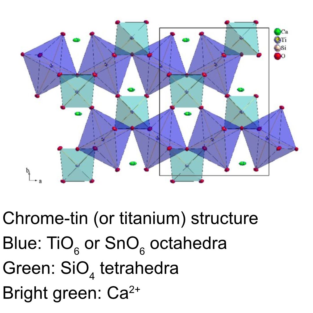 Continuing with chromium, another yellow. This is based on perovskite, CaTiO3 (but may work if you substitute the Ti with Sn). Adding <0.1% molar of Cr2O3 to the CaTiO3 will result in a yellow, with the strongest yellow at about 0.03%. Practically speaking, as any excess Ca will just act as a standard alkali earth, the Cr2O3 needs to be 0.03% of the TiO2.
