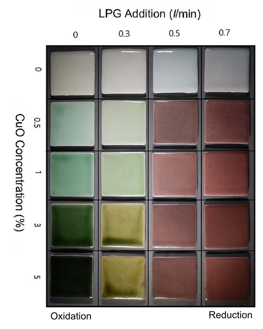 Copper glaze, varying Cu content and level of reduction