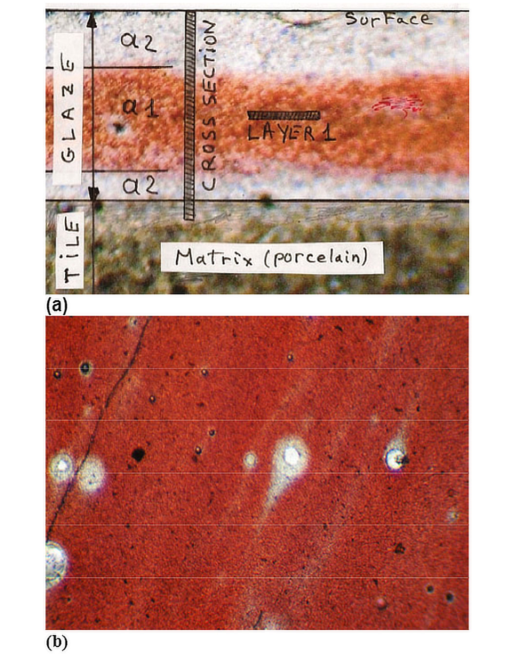 A section through a test tile, and a slice through the red layer