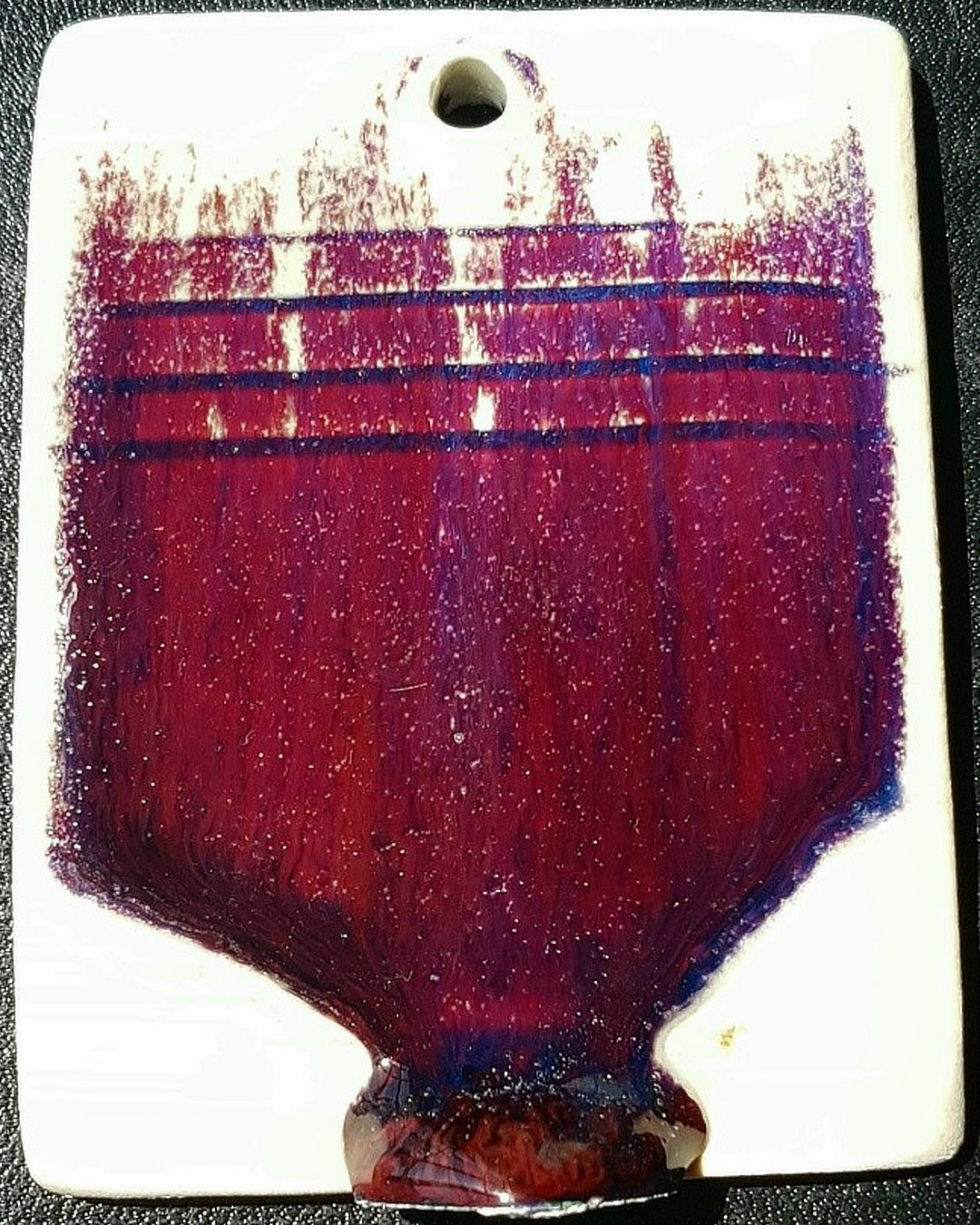 If we take a slice through the glaze, we may see several layers. Going from the surface down, we have a clear layer, possibly a thin yellow layer, the red layer, possibly a blue layer, and probably a clear layer.