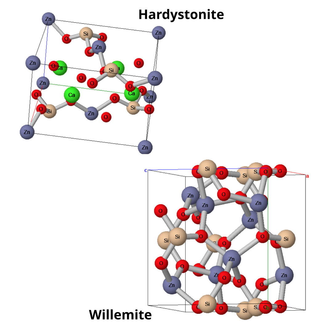 Won't these flux poor glazes to unstable? In one experiment, in a glaze with 10% molar Ca the Ca was replaced with Zn in a number of steps, the glaze structure analysed, and leaching tests performed. As the Zn increased, less B formed tetrahedra to join in with the silica network, as there was less Ca available in the glaze, and more of it was required to charge balance the Zn. So this led to phase separation - go back to my write-up on boron for details of this. It also results in Willemite (Zn2SiO4) like structures forming at high Zn levels, and the weaker Hardystonite (Ca2ZnSi2O7) at low Zn levels.